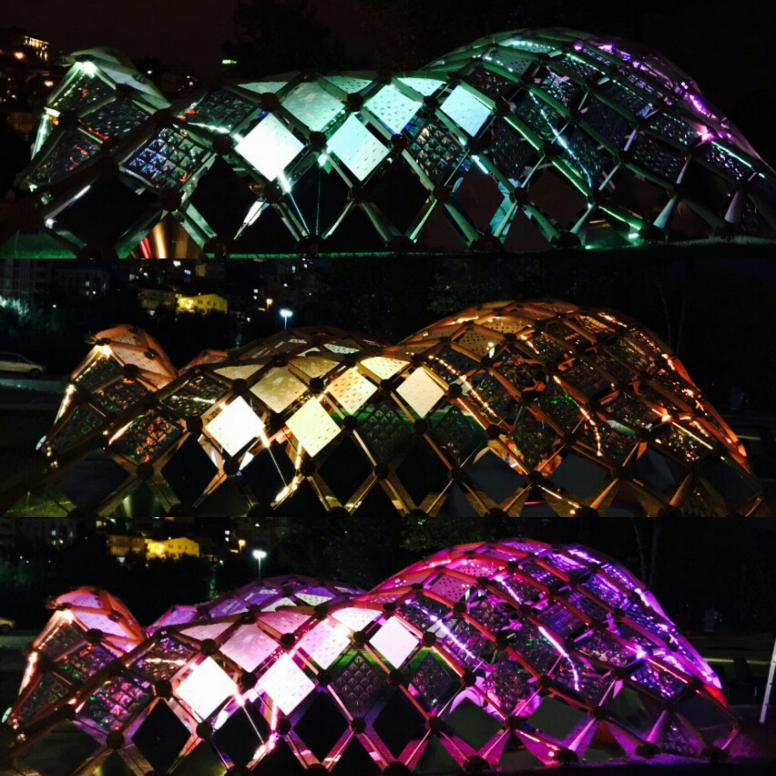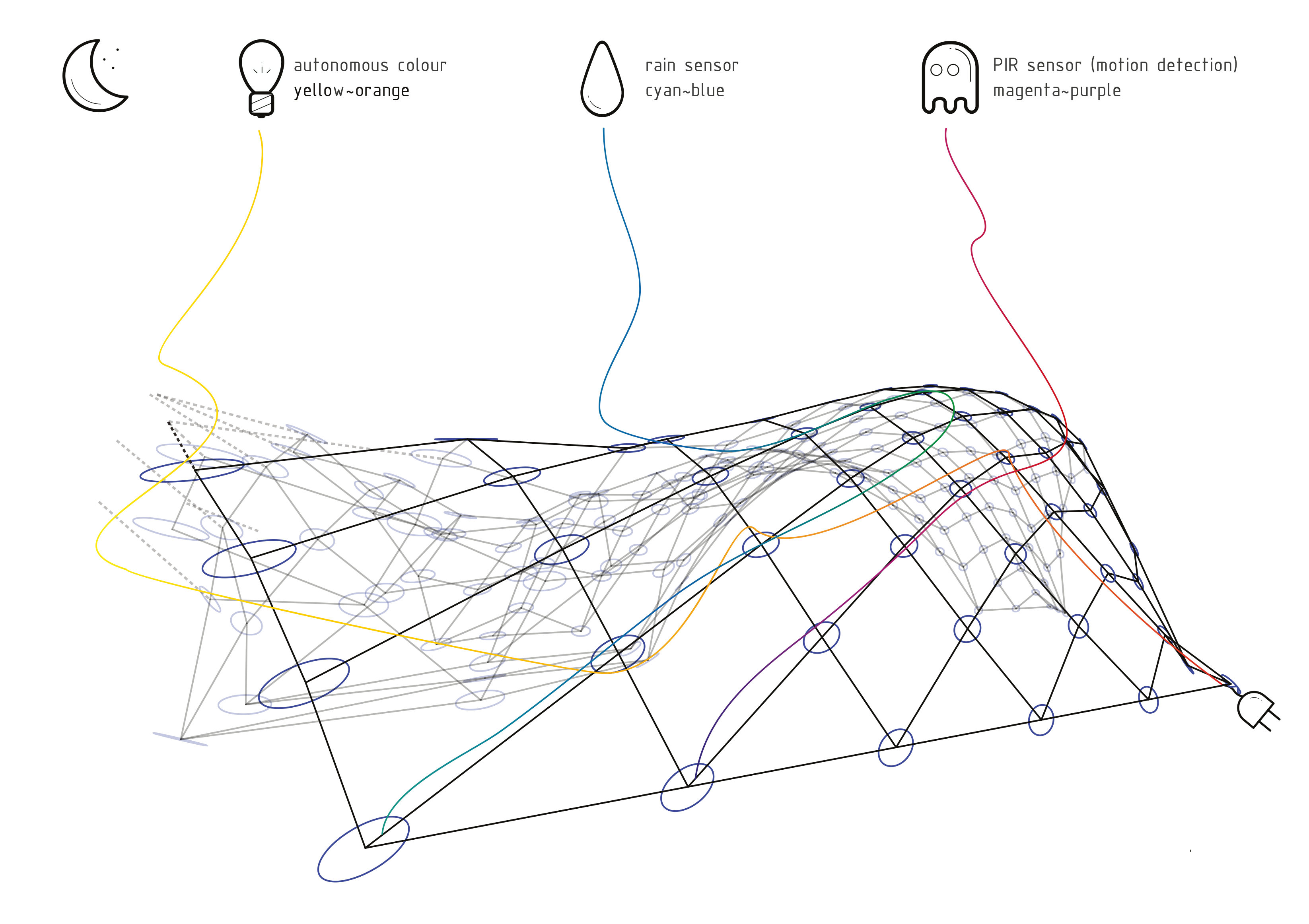 Reflections of Space is a workshop that explores relations between space and its parameters to create a 1:1 scale pavilion which is in constant feedback and interaction with its surrounding environment.  The overall design was developed in scope of effective/selected parameters and their projections in a spatial sense. The concepts of adaptability and responsiveness was discussed with various scenarios and the participants were introduced with different techniques of kinetic systems and sensors. In addition to interactive systems,  digital form finding experiments were made in order to achieve a self standing system that will allow the set of actions that are mounted.